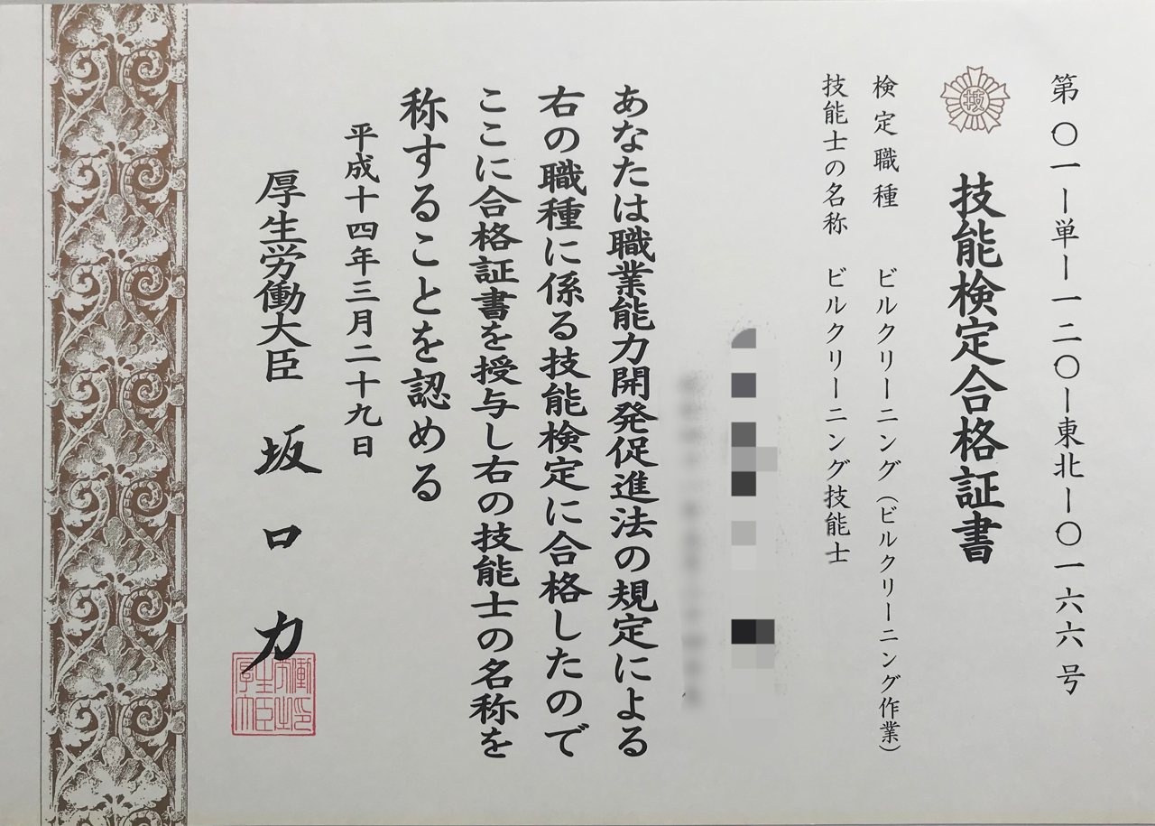 ビルクリーニング技能士(国家資格)