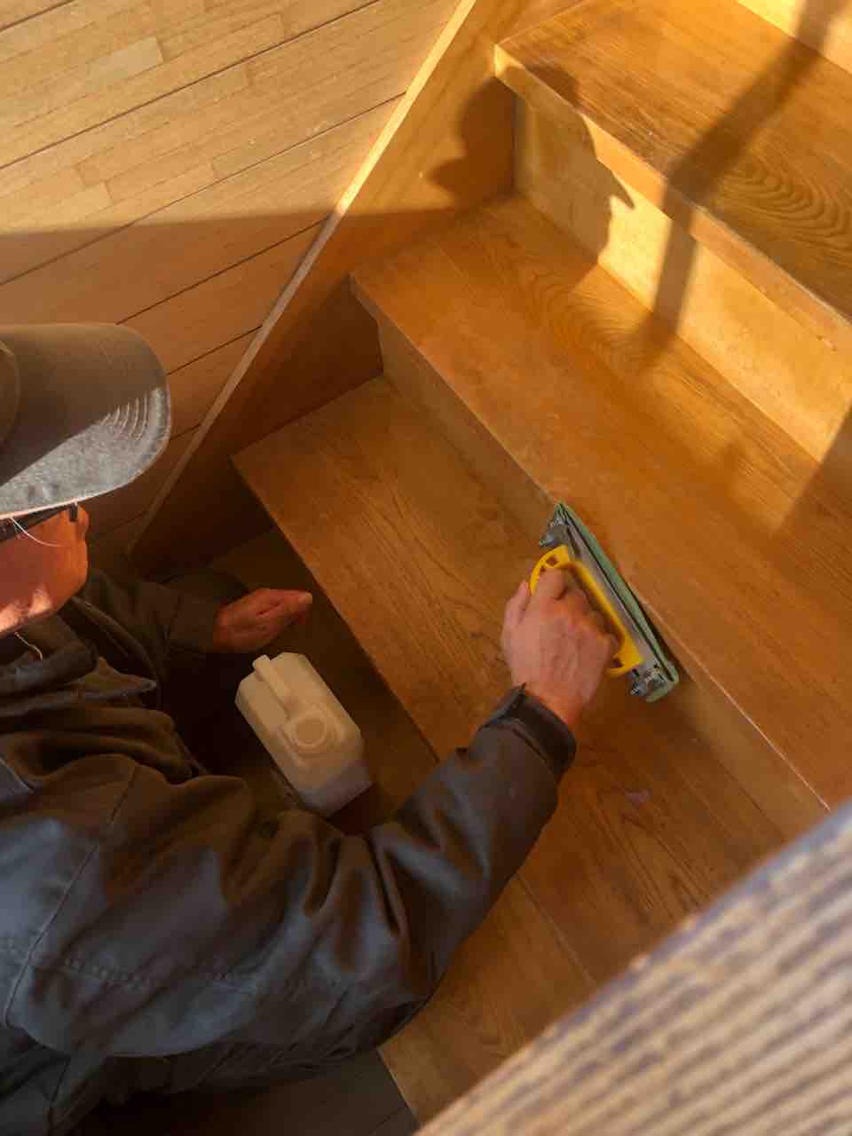 今回は階段がメインでしたので、ポリッシャーは使用せず、モップとタオルで丁寧に汚れを取り除き、水拭きします。
