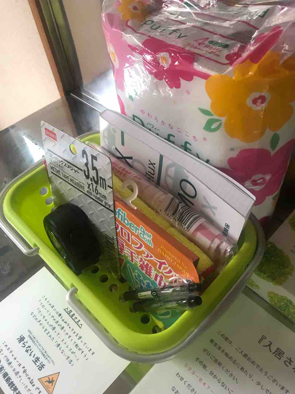 トイレットペーパーやティッシュ、ペン、メモ帳、タオルにスリッパ。それに、近隣の商業施設の地図も‼️ 入居後直ぐに必要になるであろうグッズで、これは入居者には本当に助かると思います。